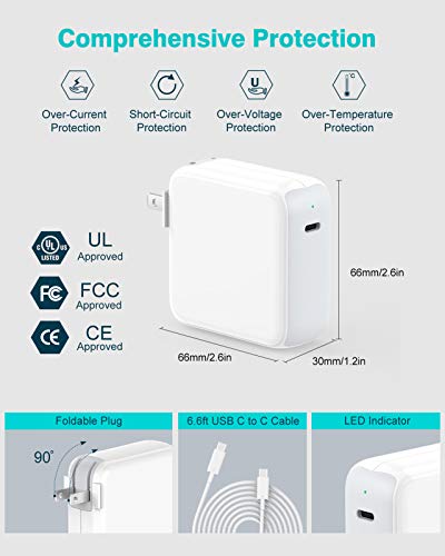 Super Fast Charging: Achieve a 50% charge on your M2 MacBook Air in just 30 minutes. Fully charge a 13-inch MacBook Pro in 1 hour and 48 minutes, keeping up with the high-speed requirements of M1, M2, and M3 chips. Optimal Battery Health: Original dynamic software and hardware systems ensure your MacBook maintains up to 98% battery capacity, intelligently adapting to reduce battery aging for a longer lifespan. Universal Compatibility: Effortlessly charge various devices with optimized output supporting 70W, 67W, 65W, 61W, 45W, 30W, and 20W. It is compatible with MacBook Pro, MacBook Air, Surface, Dell, Lenovo, HP, iPad Pro, iPad Air, iPad Mini, iPhone 15 series, and more. Durable USB-IF Certified Cable: The 6.6ft USB C to USB C cable, with USB-IF certification (ID: 800-1471), ensures a secure charging port connection and durability, lasting four times longer than standard cables. User-Friendly Design: A soft LED indicator lets you know your device is charging without being intrusive, while the foldable plug makes it easy to take while traveling. Dependable Safety: Built-in safeguards and a cooling system protect against overcharging, short circuiting, and overheating, with intelligent temperature monitoring for peace of mind.
