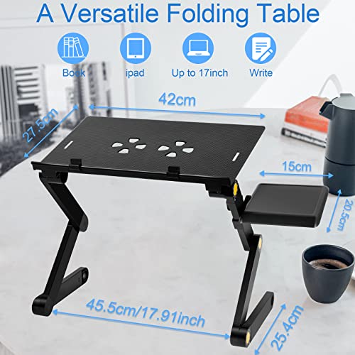 Material: Constructed with lightweight, high-strength aluminum and adjustable ABS plastic joints, ensuring durability and flexibility. Dimensions: 16.9"D x 11.61"W x 2.55"H, making it compact and portable for easy travel and storage. Design: Includes an extra anti-slip clip to secure your device, and hollow uprights to promote air circulation and heat dissipation, protecting your laptop. Adjustability: Easily change the leg height to create an ergonomic workspace on your bed, sofa, or desk. The foldable design allows for quick setup and convenient transport in your backpack or briefcase. Anti-slip Feature: Rubber pads prevent your laptop from slipping and protect its case.